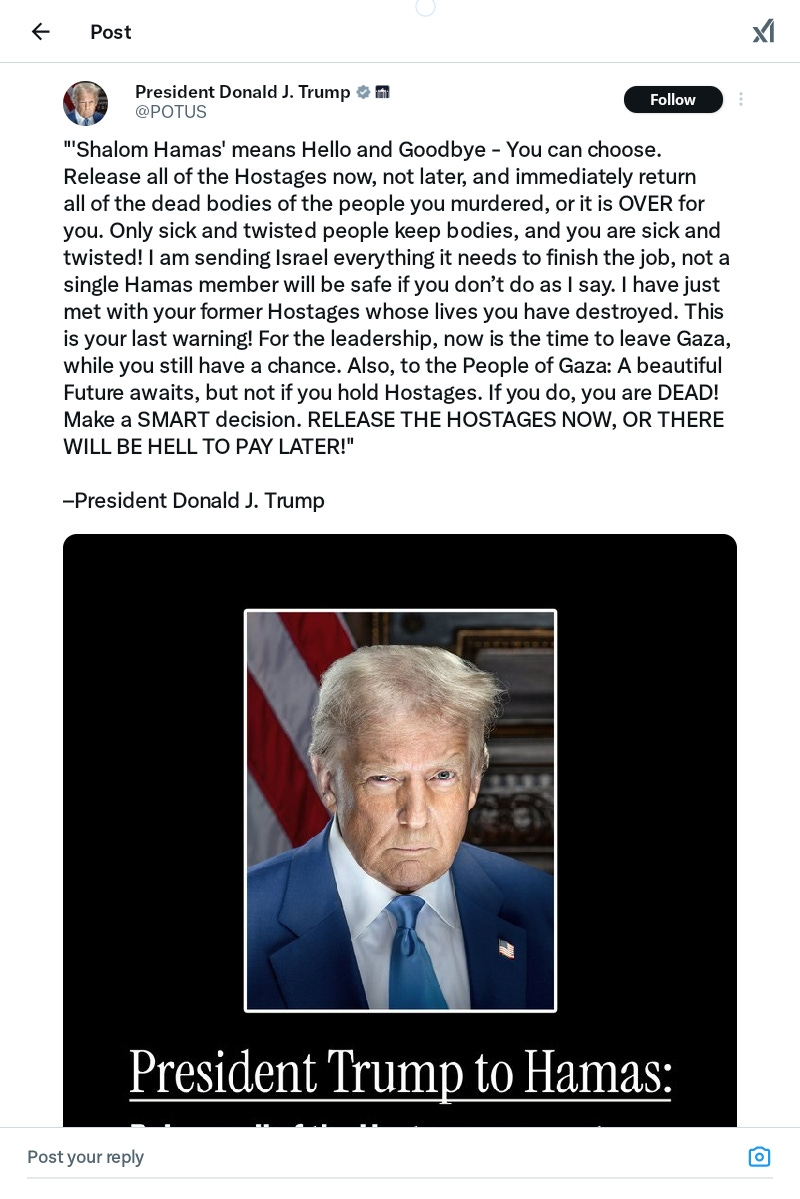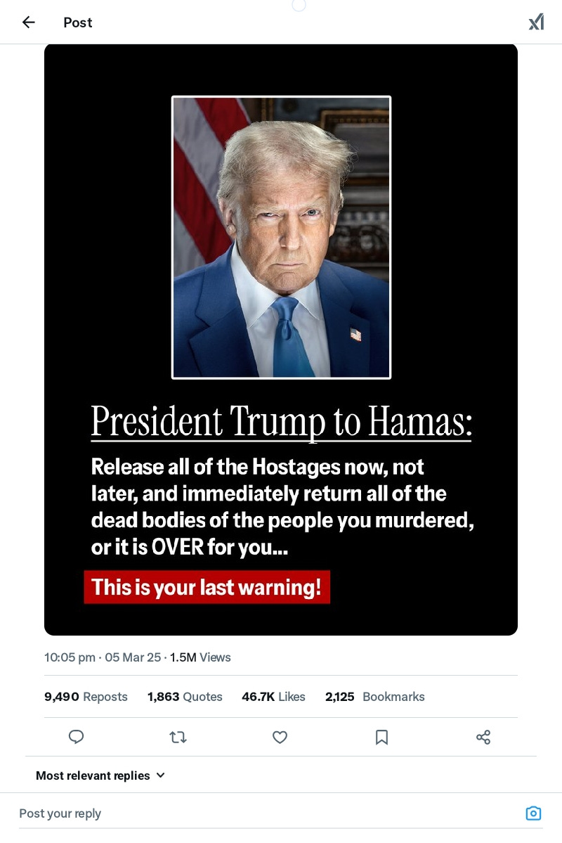 TRUMP THREATENS TO FURTHER GENOCIDE AND MURDER ALL GAZAN PALESTINIANS!!!UNBELIEVABLE!!!! 𝗔𝗔𝗥𝗢𝗡 𝗣𝗔𝗨𝗟 𝗔𝗴𝗮𝗶𝗻𝘀𝘁 𝗚𝗲𝗻𝗼𝗰𝗶𝗱𝗲Mar 05, 2025978SharePlease all mass report Trump's Tweet!!!PreviousNext